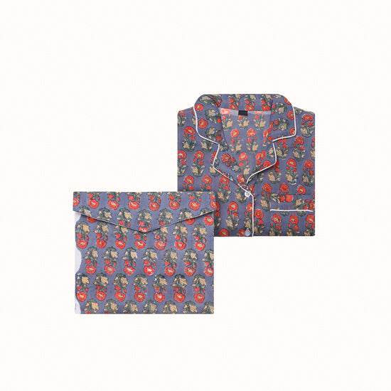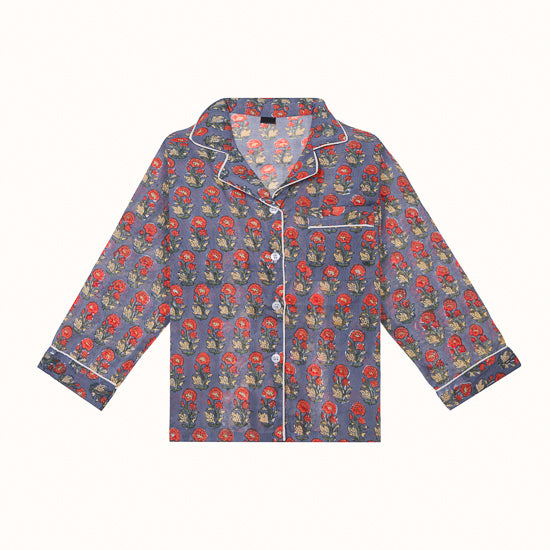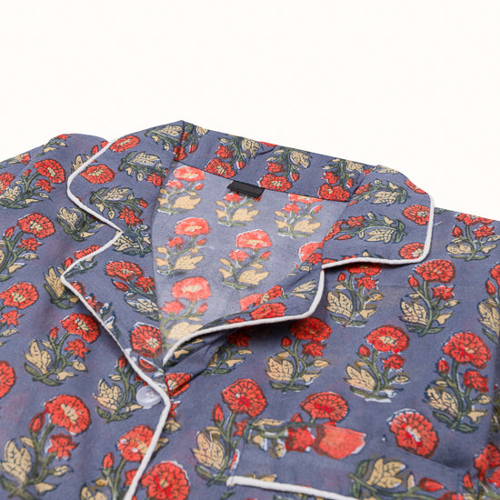 Pyjama en coton blockprint bleu indigo imprimé fleurs rouge poppy.