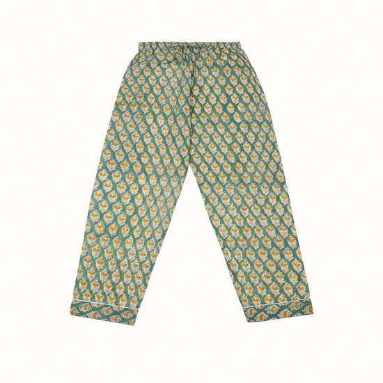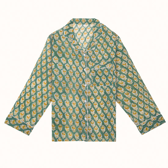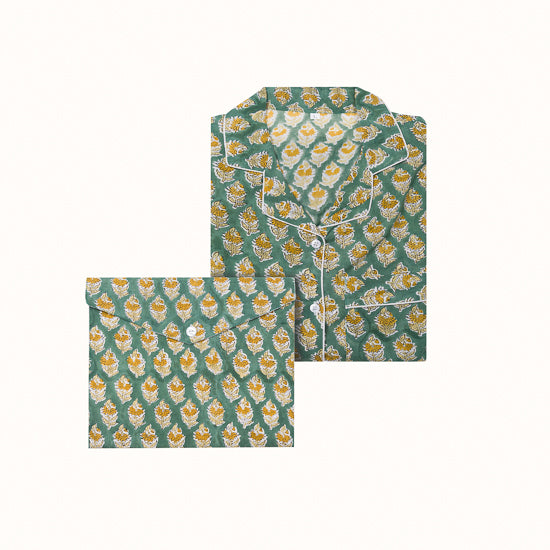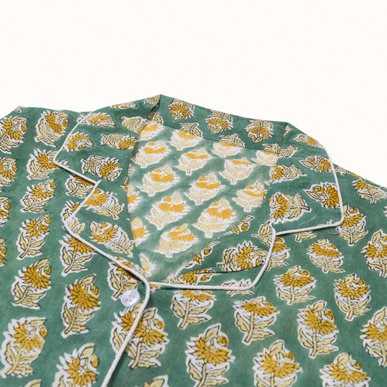 Pyjama en coton blockprint vert forêt imprimé fleurs jaune safran.
