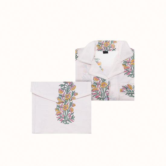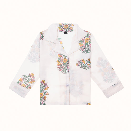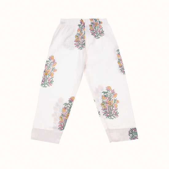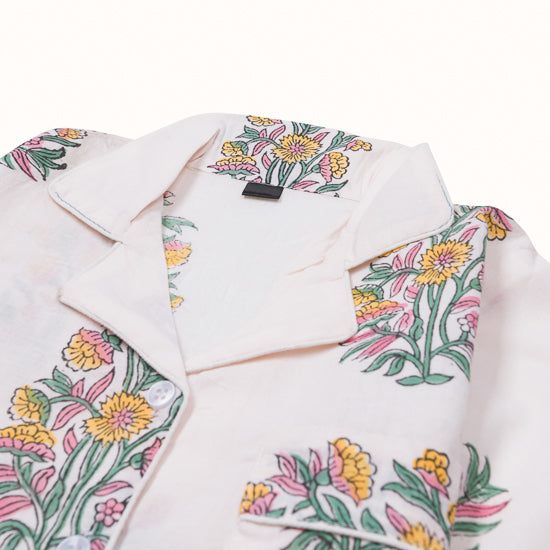 Pyjama en coton blockprint blanc imprimé fleurs roses et jaunes.
