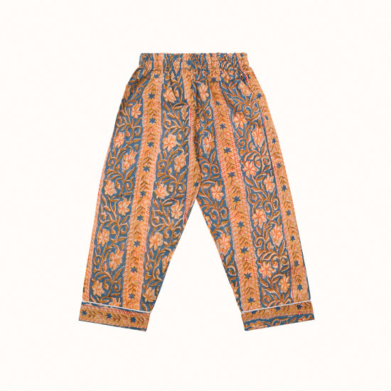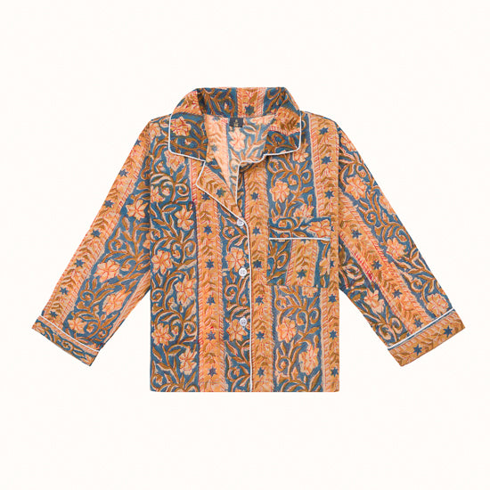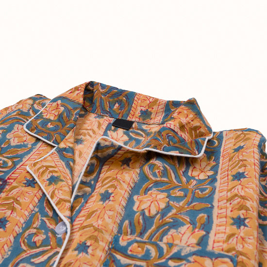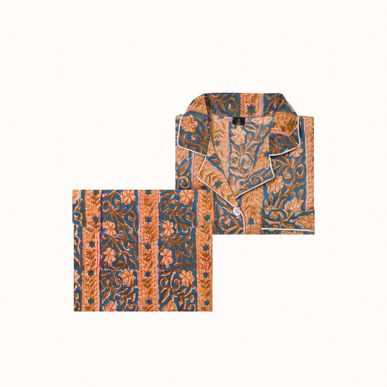 Pyjama en coton blockprint bleu denim et beige imprimé fleurs ton sur ton.