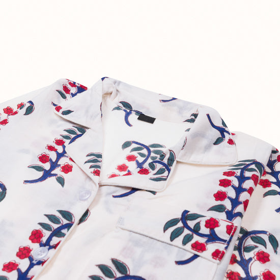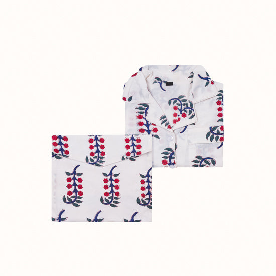 Pyjama en coton blockprint blanc imprimé fleurs bleu nuit et rouge.