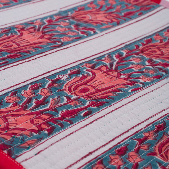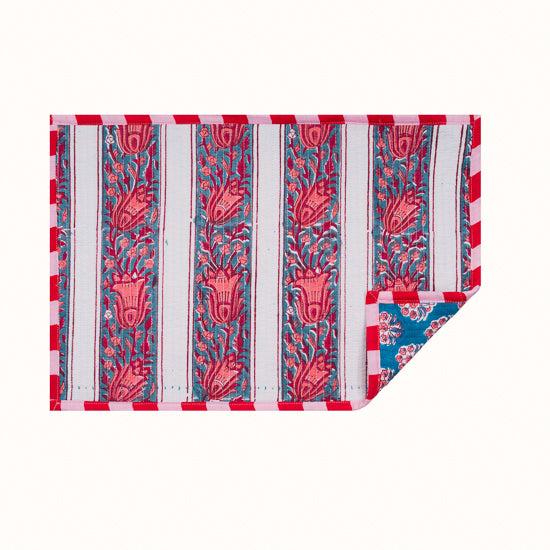Set de table rectangulaire réversible en coton imprimé blockprint, et finition matelassée.