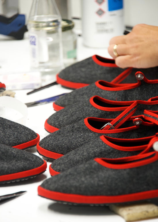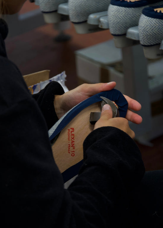 Plusieurs étapes précèdent l'assemblage final d'une friulane. Les tissus doivent être doublés, puis découpés selon un gabarit; les gros grains cousus à la main sur chaque pièce ainsi que sur chaque semelle intérieure, sans oublier les étiquettes qui doivent elle aussi être cousues sur les semelles. On coud le tout ensemble et direction l'assemblage !